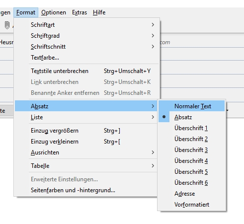 Das gleiche Problem kenne ich aus “Thunderbird”, hier kann man das aber in den “Format”-Einstellungen anpassen, indem man unter “Absatz” den Punkt “Normaler Text” auswählt (siehe Screenshot).