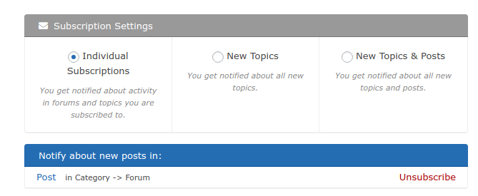 I have several categories with the same subforum names (introduction, general discussion, etc) and when a user subscribes to it, only the name of the topic (such as introduction) appears on the subscription page. It’s not clear which subscription is which.